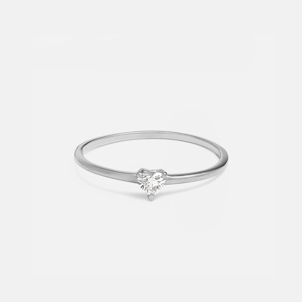 L’anello in oro 18 kt accoglie un diamante a forma di cuore, che illumina la linea con delicatezza ed equilibrio.