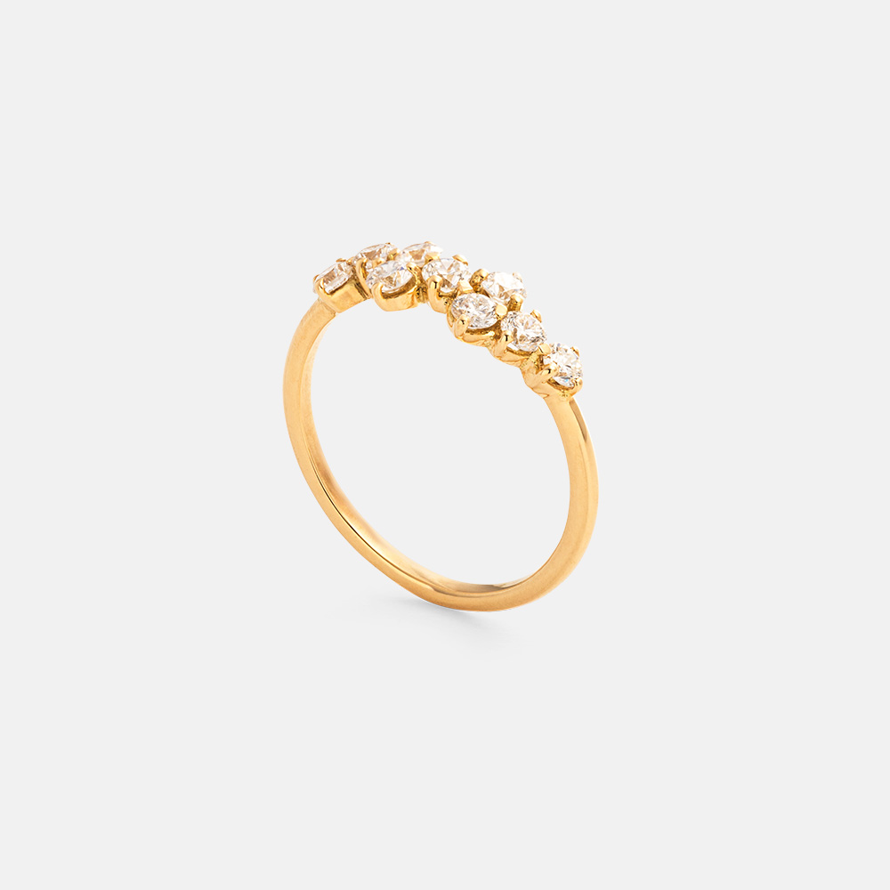 L’anello Lumina è una sintesi perfetta di eleganza e originalità, con diamanti da 0,46 carati totali che brillano in una disposizione sfalsata, esaltando la bellezza e la luce di ciascuna gemma.