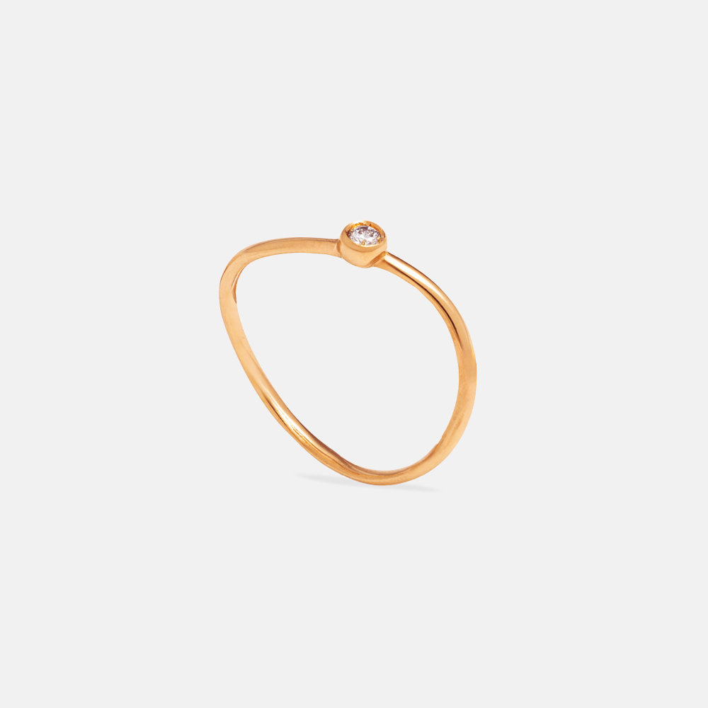 L’anello in oro 18 kt, disegnato da una linea ondulata e armoniosa, accoglie un diamante da 0,035 ct che ne esalta la luminosità con eleganza naturale.