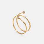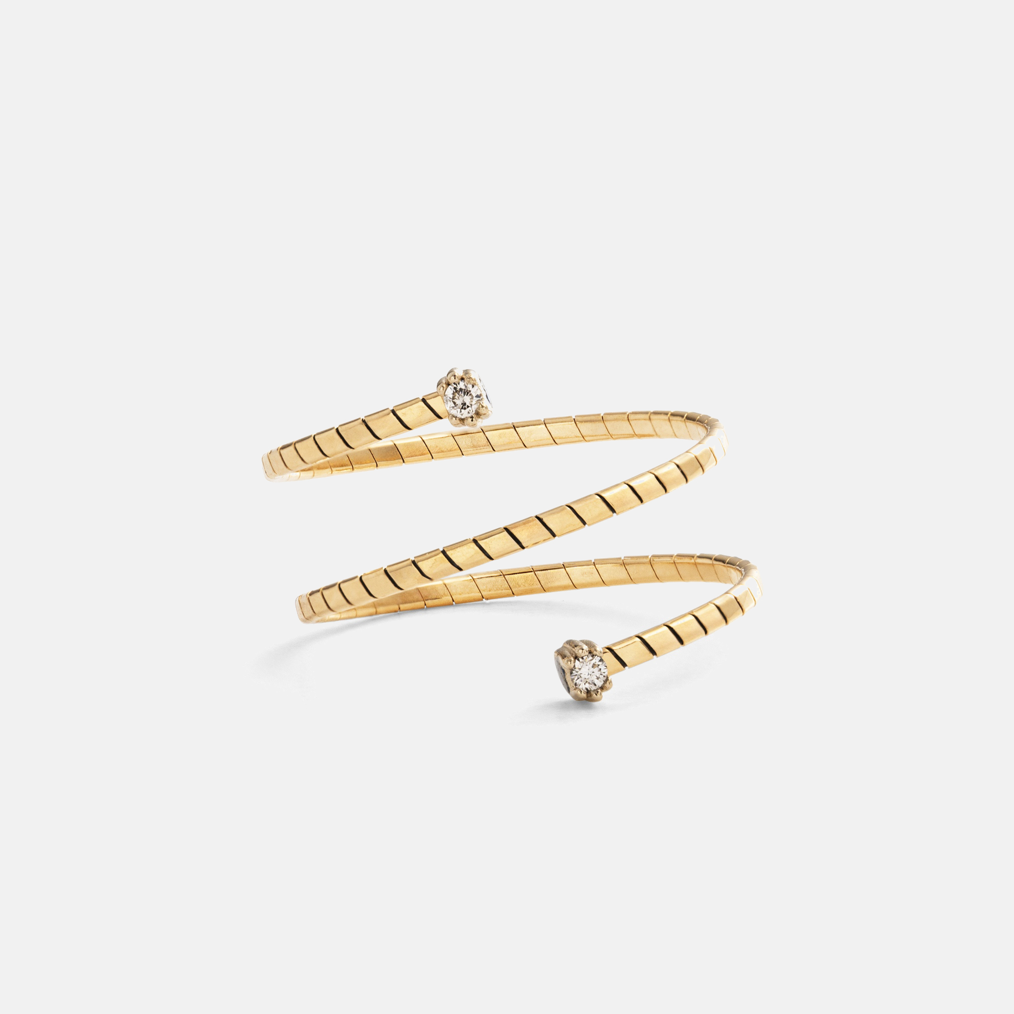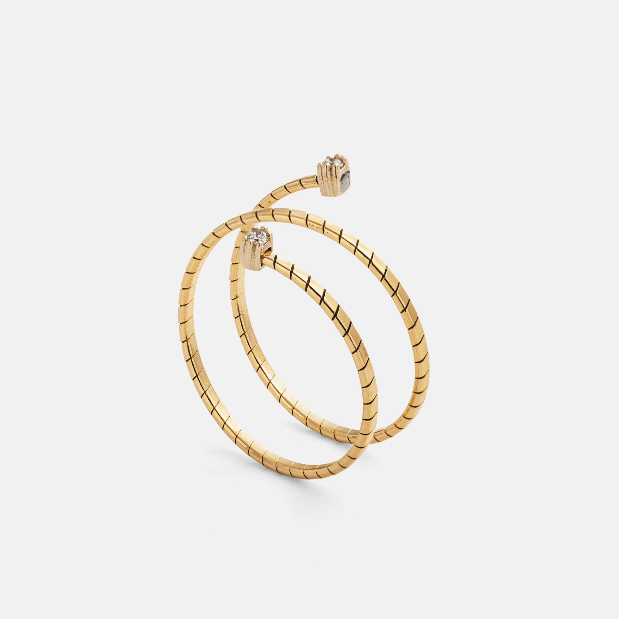Anello a spirale in oro 18 kt, impreziosito da due diamanti posizionati strategicamente per esaltare il design dinamico e sofisticato. Un connubio perfetto tra eleganza contemporanea e minimalismo, con una struttura leggera che valorizza la luminosità dei diamanti. Ideale per chi desidera un gioiello unico e senza tempo.