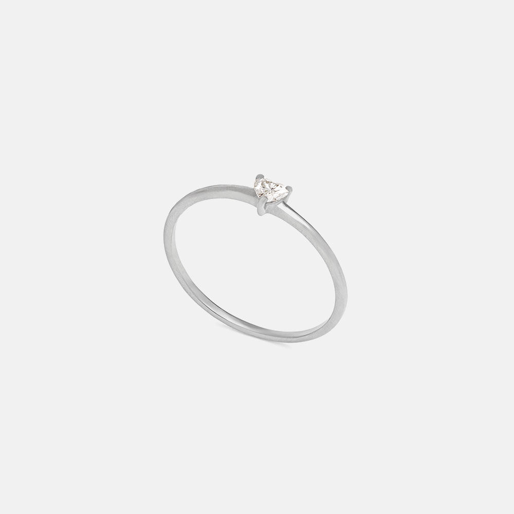 L’anello in oro 18 kt accoglie un diamante a forma di cuore, che illumina la linea con delicatezza ed equilibrio.