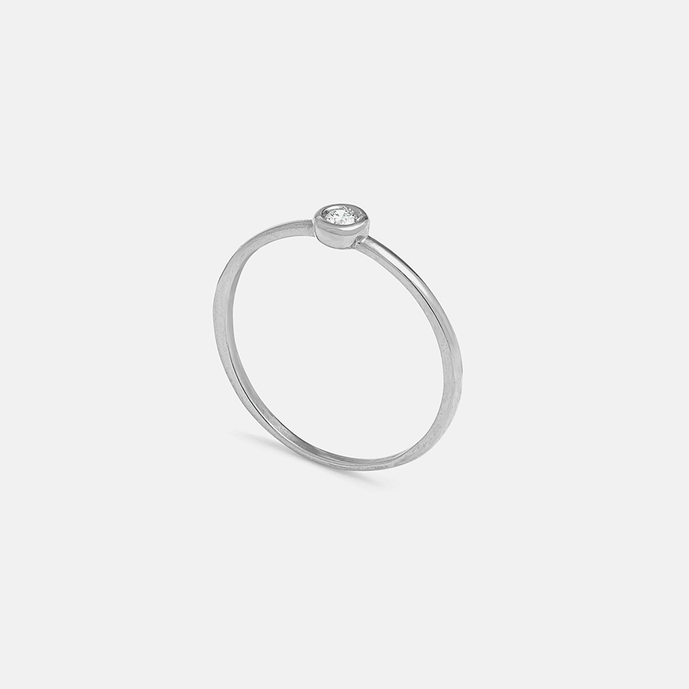 L’anello rigido in oro 18 kt accoglie un diamante che illumina la forma con discreta eleganza, creando un perfetto equilibrio tra purezza e brillantezza.