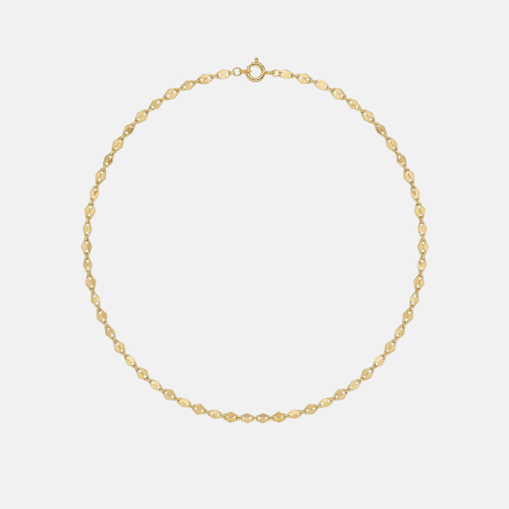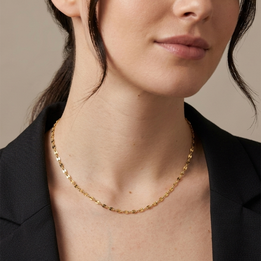La maglia in oro 18 kt, dalle forme morbide e luminose, crea una sequenza continua che riflette la luce ad ogni movimento.